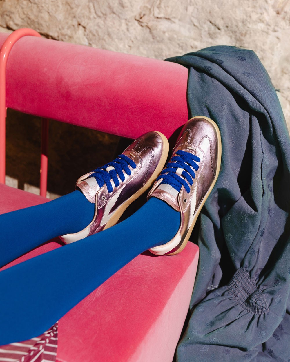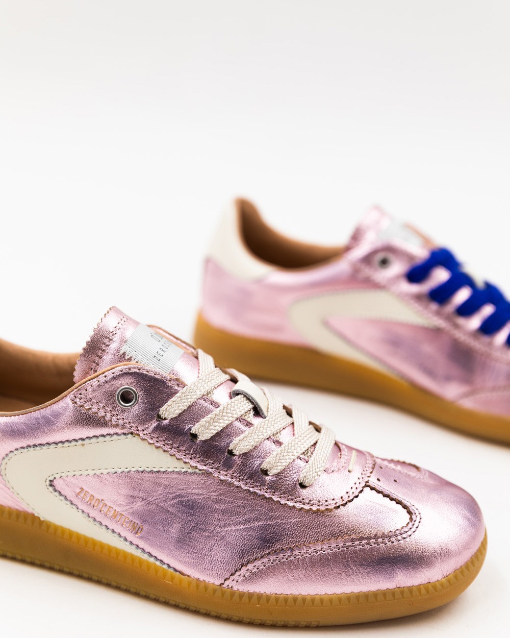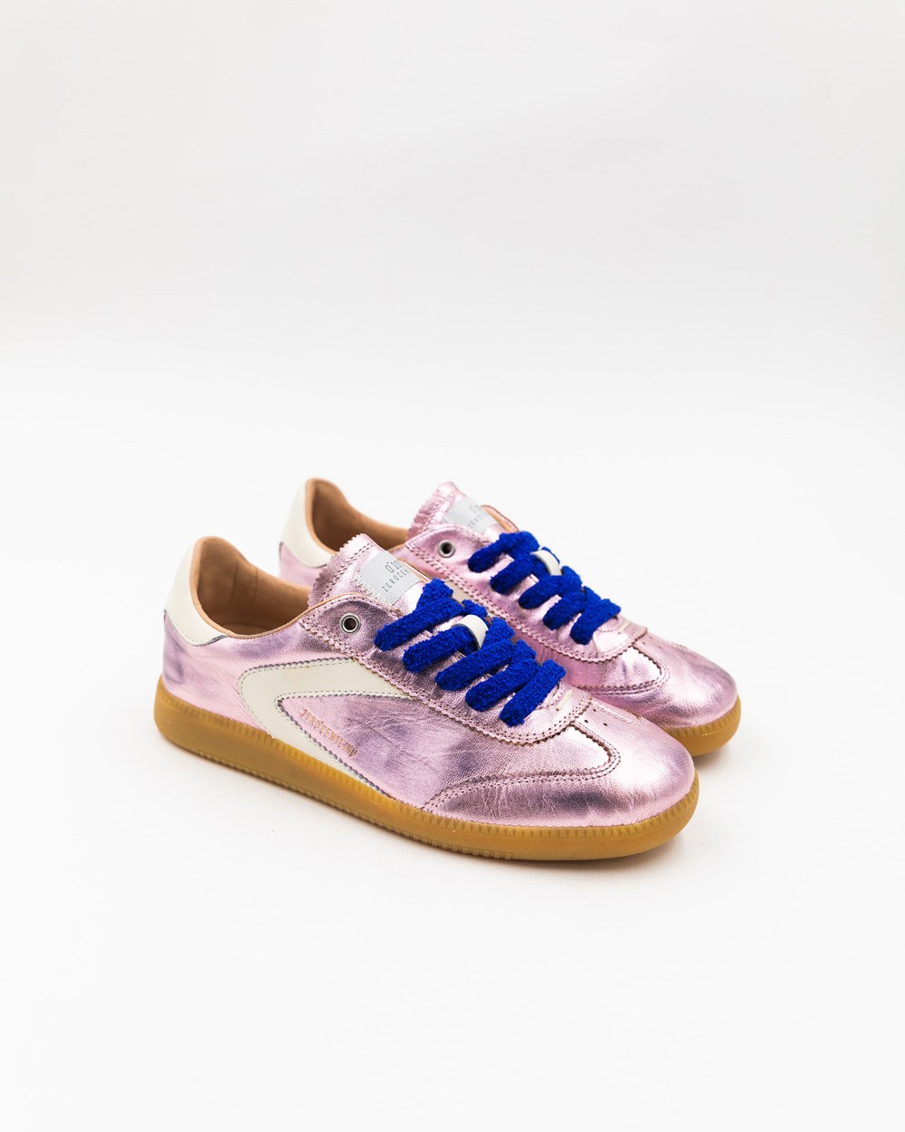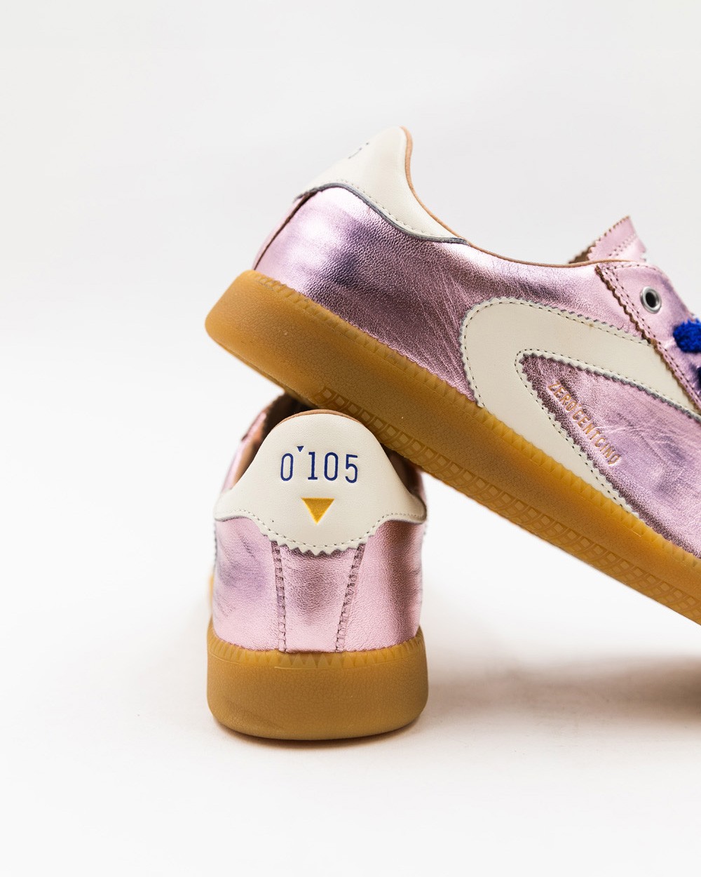 This truly charming model captivates with its metallic pink leather, featuring a distressed effect that enhances its vintage allure and gives it a unique touch of authenticity. The metallic leather brings a captivating shine that adds character to the shoe. For a more daring look, this version comes with a pair of electric blue laces that elevate the ensemble, creating a vibrant version that will surely draw attention.