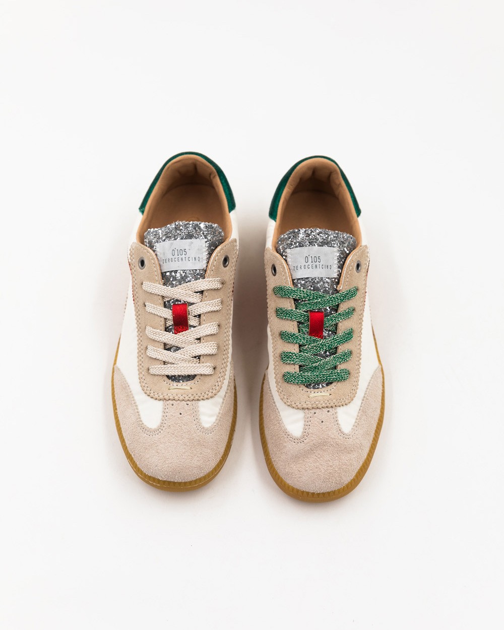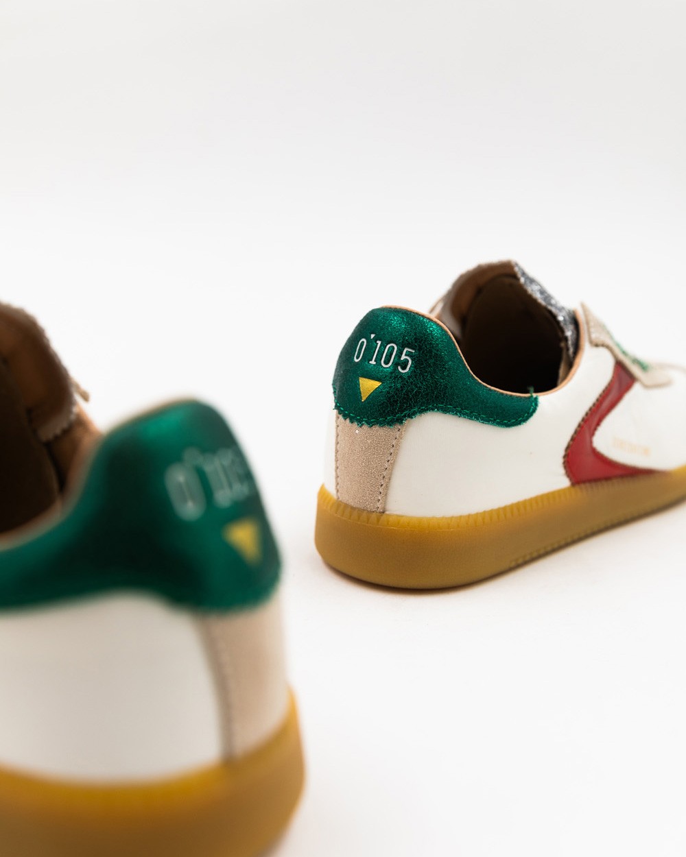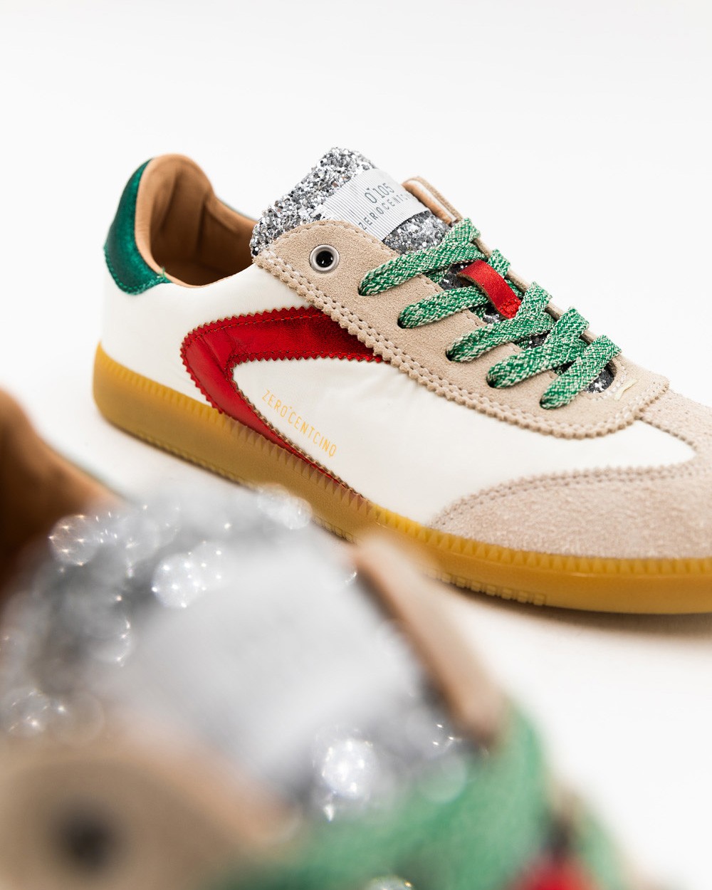 With a gum-colored sole that evokes classics from the past, and a touch of whimsy with its glitter tongue, our Nova Red Green is sure to seduce! The white nylon base provides a bright canvas that contrasts beautifully with the red and green metallic leather accents. A playful version perfect for those who enjoy standing out while maintaining timeless elegance.