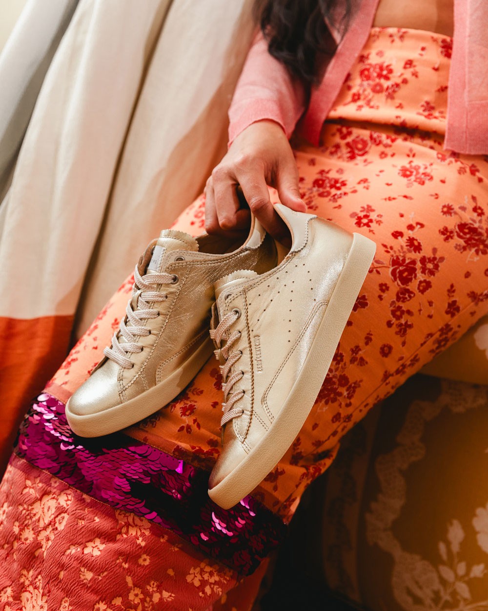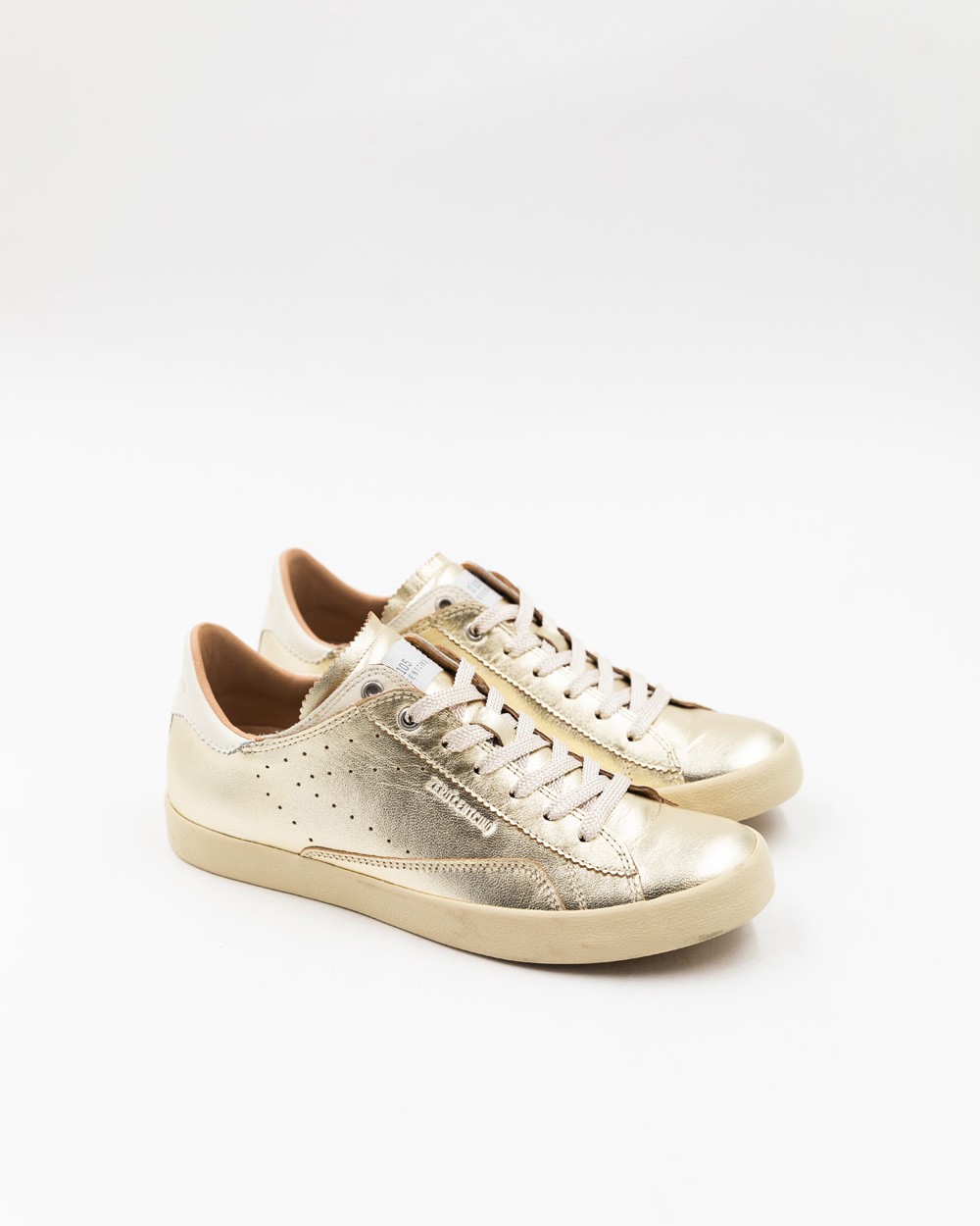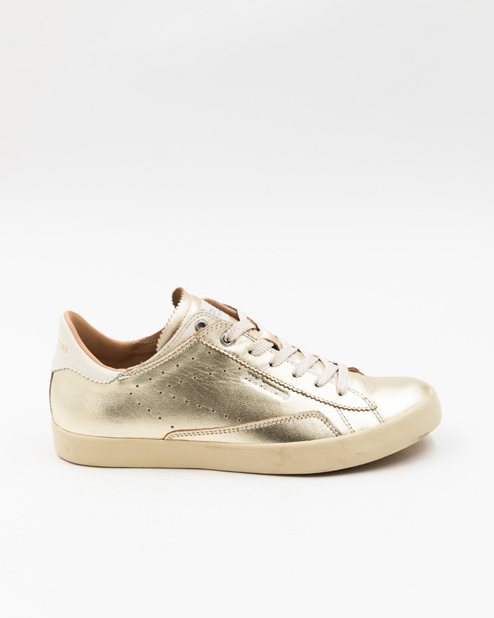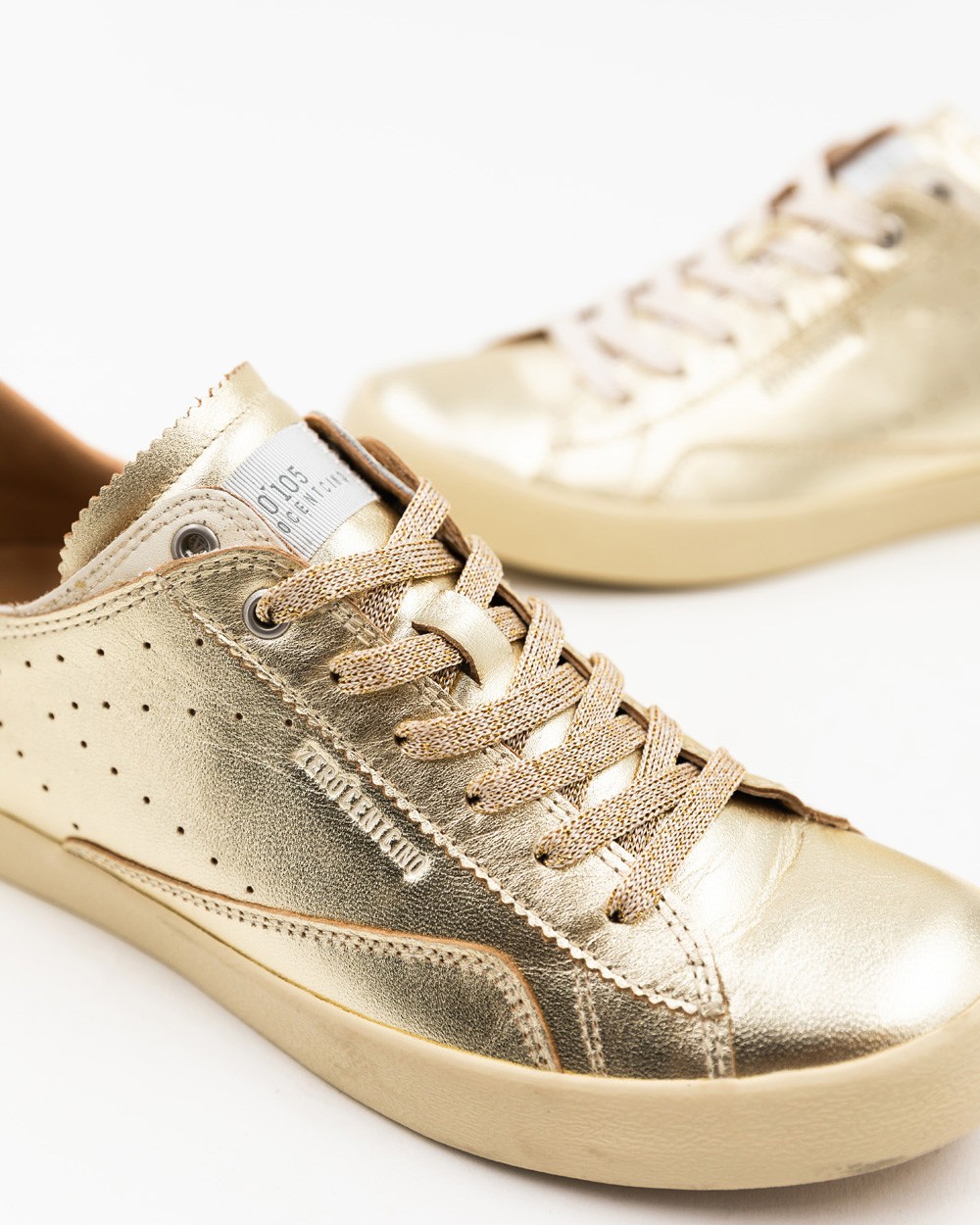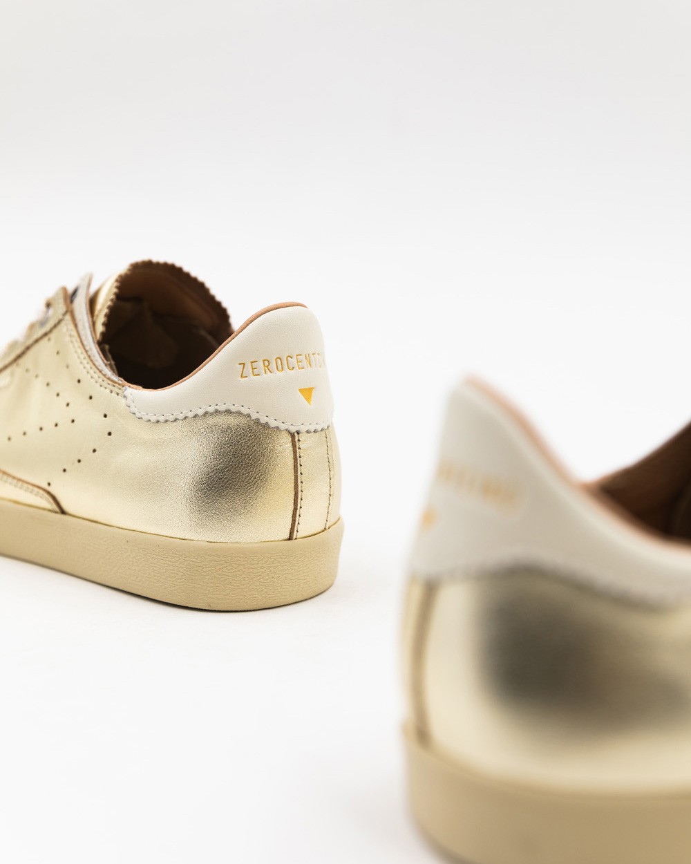 Adopt luxury with this version of our iconic SC06, a sneaker that embodies boldness and elegance. Fully adorned in metallic gold leather, this captivating shoe stands out with its matte white panel at the back, adding a touch of subtle contrast. Perfect for any occasion, it brings a hint of sophistication to your casual or dressed-up attire, affirming your taste for refined and modern aesthetics.