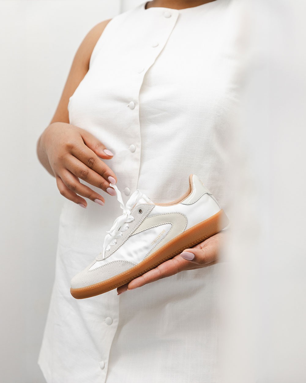 Diseñadas para quienes buscan un look elegante y atemporal, estas zapatillas de satén blanco ofrecen una textura sedosa que capta la luz y realza tus atuendos. Los cordones a juego en satén completan este estilo elegante, brindando una armonía sutil y una comodidad ligera. Disponibles en tres colores, estas zapatillas se adaptan a todas las ocasiones, ya sea para una salida casual o un evento más formal. Su diseño limpio y femenino se combina fácilmente con un guardarropa veraniego.
