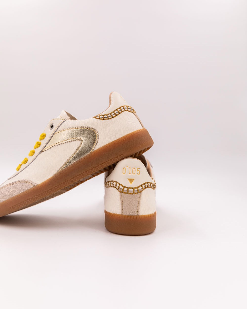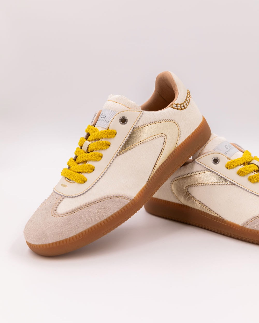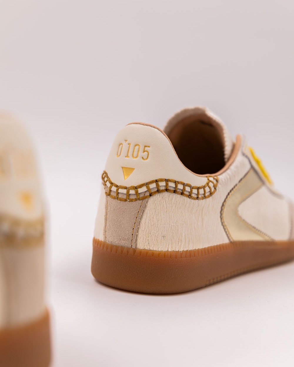Su cuero de pelo blanco roto, con una textura lujosa y afelpada, crea una silueta suave y cálida. Todo ello está sutilmente realzado por las costuras amarillas que aportan dinamismo y luz. Los cordones de felpa, a juego con las costuras, completan el conjunto con un toque de comodidad y frescura. Este toque de color audaz subraya la autenticidad y singularidad de estas zapatillas. La riqueza de los materiales y los detalles las convierte en un objeto de lujo que no tendrás dificultad en combinar.