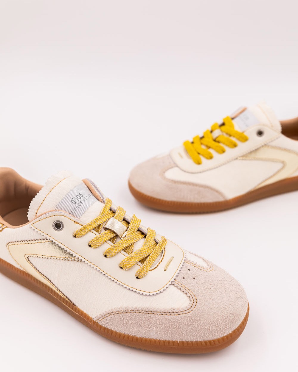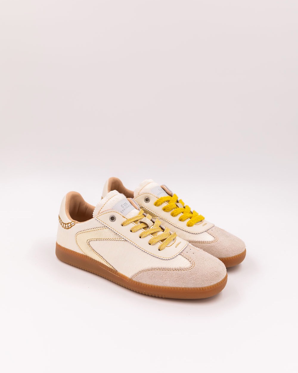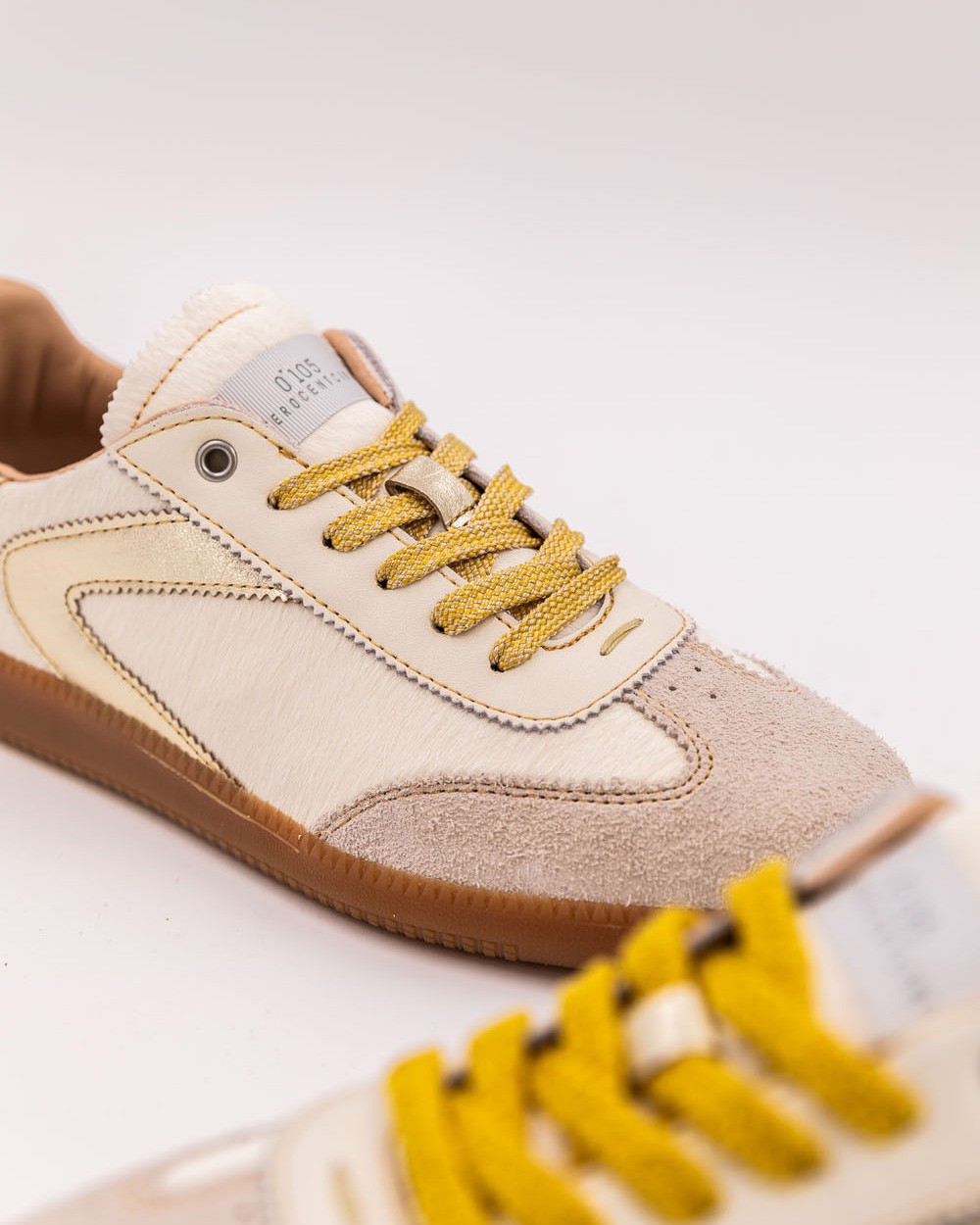 Su cuero de pelo blanco roto, con una textura lujosa y afelpada, crea una silueta suave y cálida. Todo ello está sutilmente realzado por las costuras amarillas que aportan dinamismo y luz. Los cordones de felpa, a juego con las costuras, completan el conjunto con un toque de comodidad y frescura. Este toque de color audaz subraya la autenticidad y singularidad de estas zapatillas. La riqueza de los materiales y los detalles las convierte en un objeto de lujo que no tendrás dificultad en combinar.