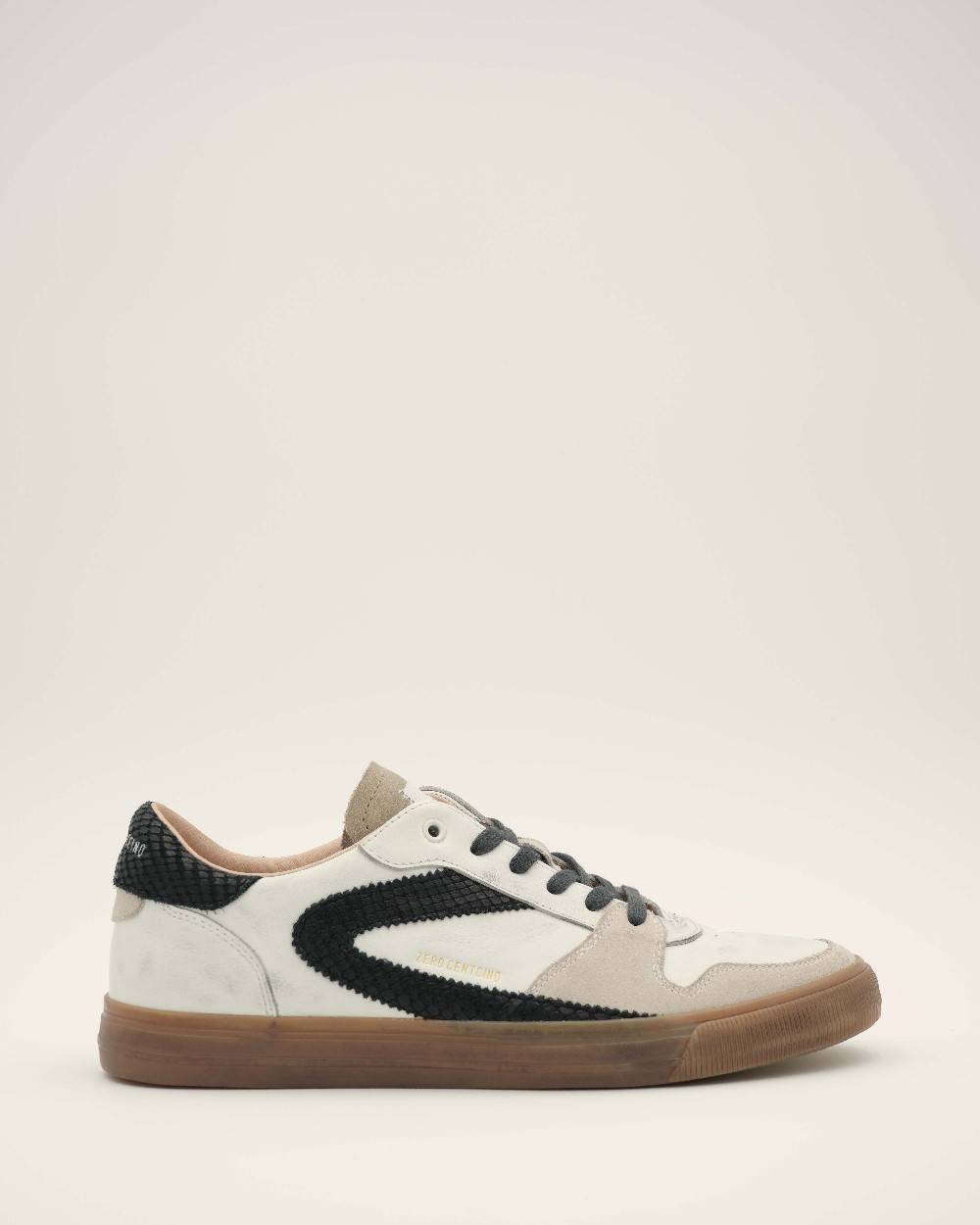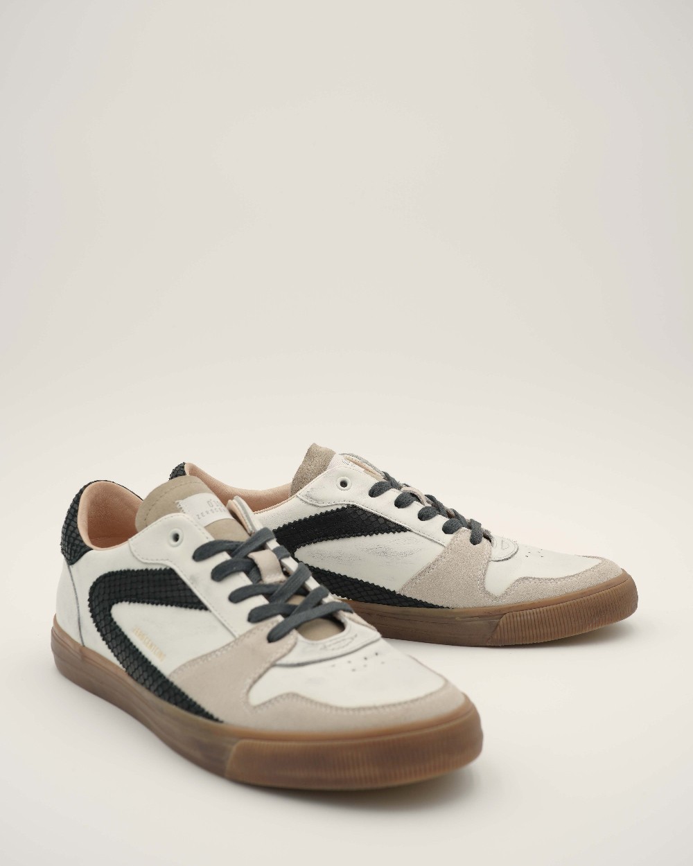 - Cuir lisse blanc, cuir suède craie et cuir gaufré noir.